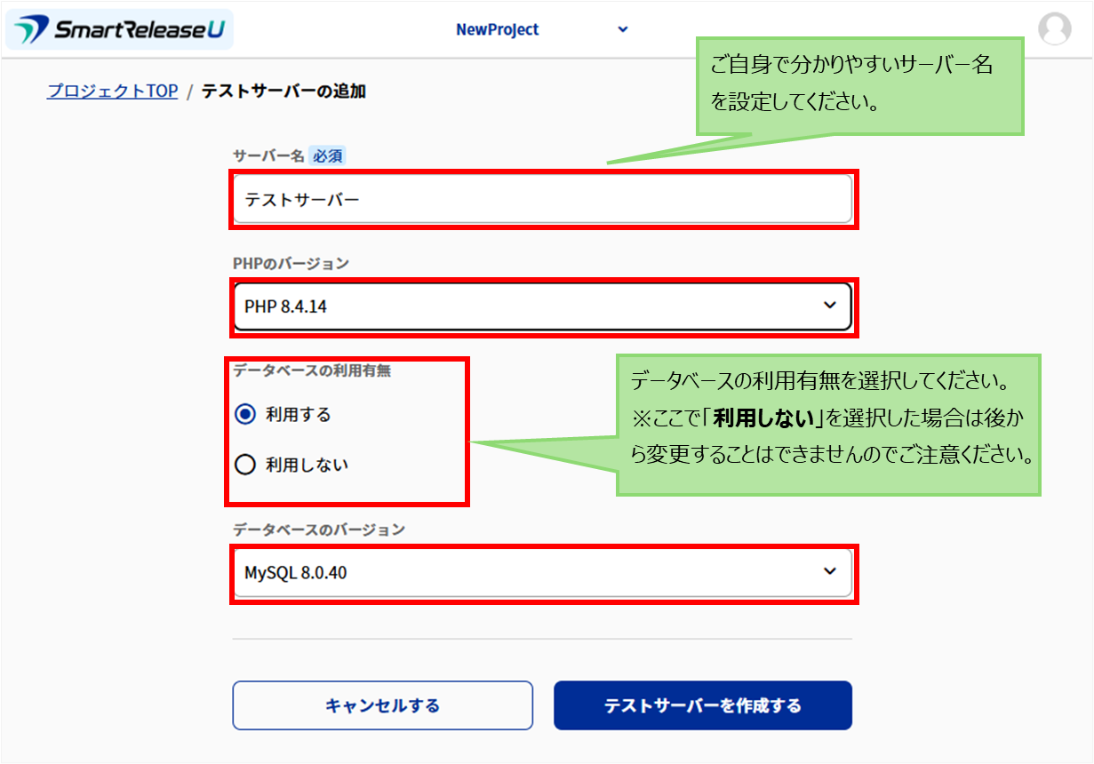 2.「サーバー名(必須)」の入力と「PHPのバージョン」、「データベースの利用有無」、「データベースのバージョン」を入力または選択。