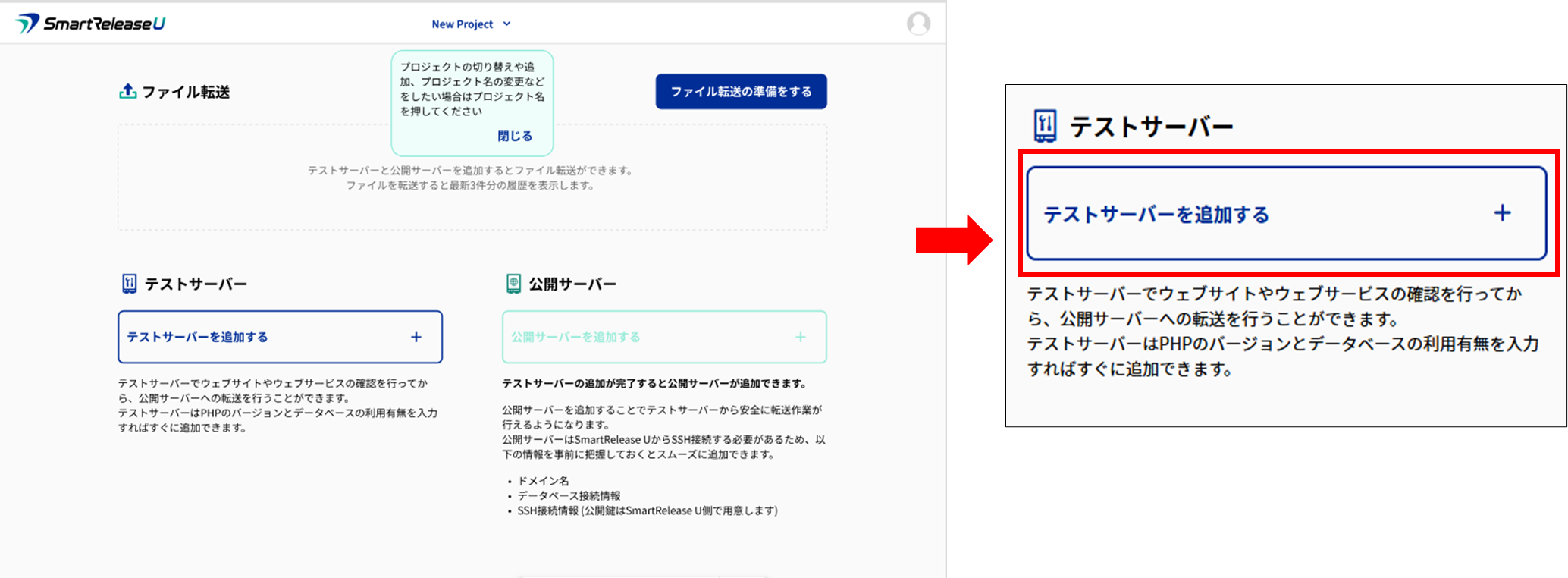 1.プロジェクトTOPから「テストサーバーを追加する」をクリック。