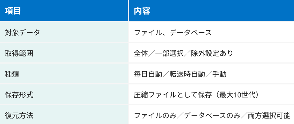 バックアップ対象データ、取得範囲、種別については以下の通りです。