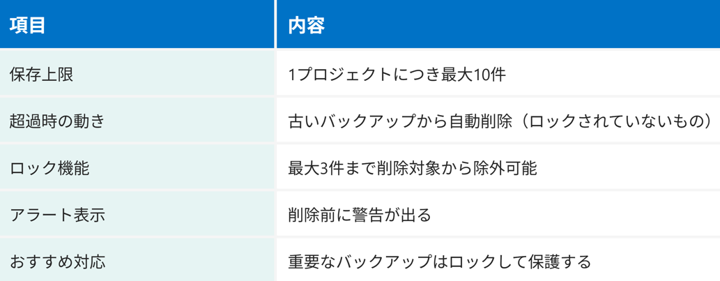 1つのプロジェクトにつき最大10件までバックアップを保存できます。