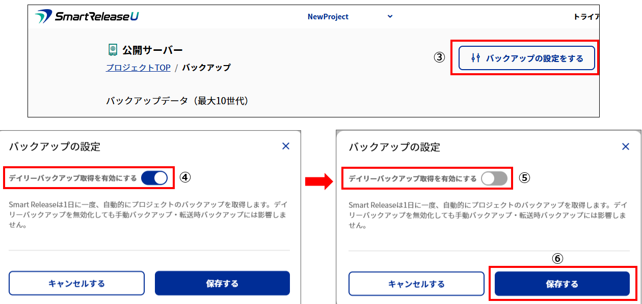 2.画面上部➂「バックアップの設定をする」をクリックし後、バックアップの設定画面④「デイリーバックアップを有効にする」のトグルスイッチを「オン」から➄「オフ」にし、