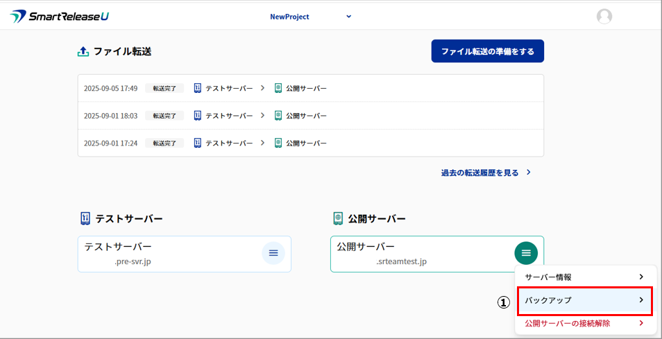 1.プロジェクトTOP画面の公開サーバー右側の「三」マーク(メニュー)をクリック後、