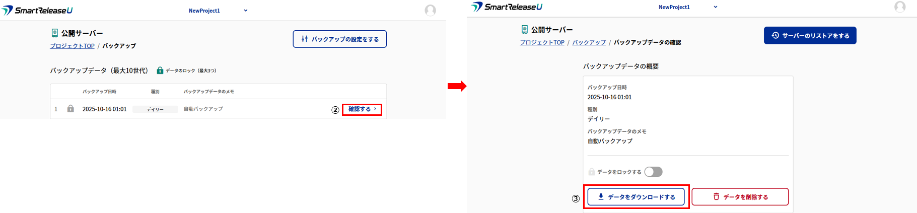 2.バックアップ一覧画面から➁「確認する」をクリック後、バックアップデータ確認画面から、➂「データをダウンロードする」をクリック。