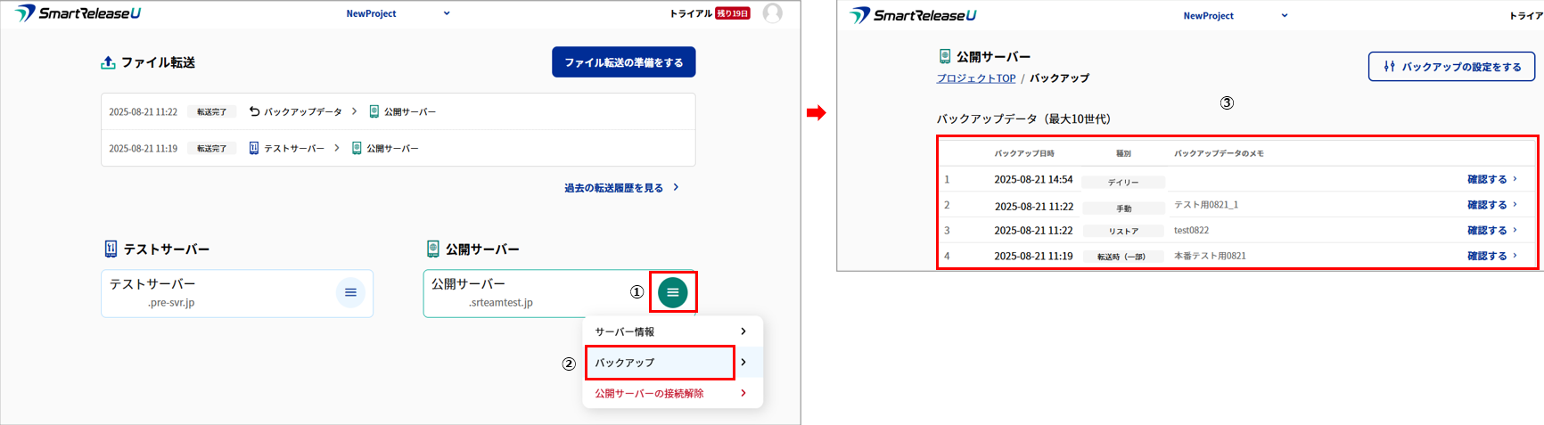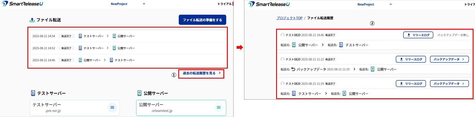 ①「過去の転送履歴を見る」をクリックすると、過去の➁「ファイル転送履歴」が一覧で確認できます。また「リリースログ」やバックアップデータのダウンロードもできます。