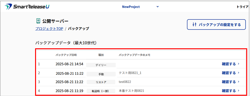 プロジェクトトップの公開サーバーから「バックアップ」を選ぶと、