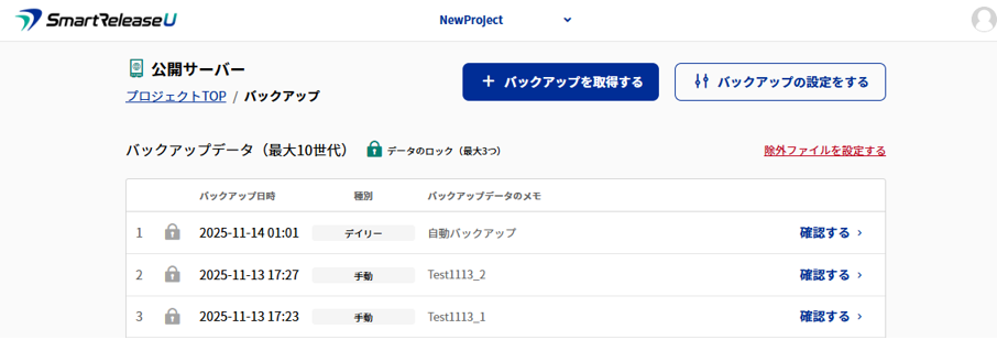 3.保存後、バックアップ一覧画面に戻り、除外ファイルの設定は完了です。