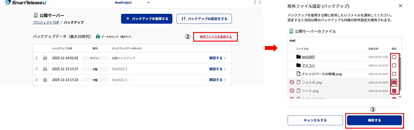 2.バックアップ一覧画面から➁「除外ファイルを設定する」をクリック後、除外ファイル設定(バックアップ)画面より除外したいファイルやフォルダを選し、➂「保存する」をクリック。