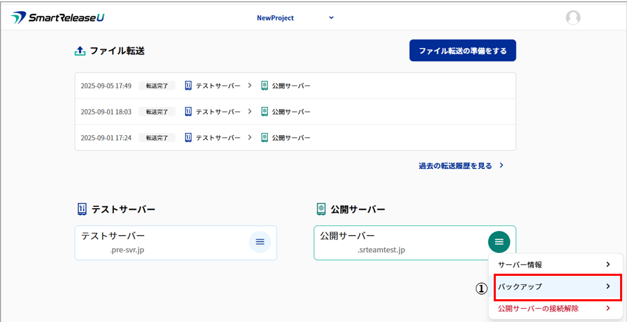1.プロジェクトTOP画面、公開サーバー右側の「三」マーク(メニュー)をクリック後、①「バックアップ」をクリック。