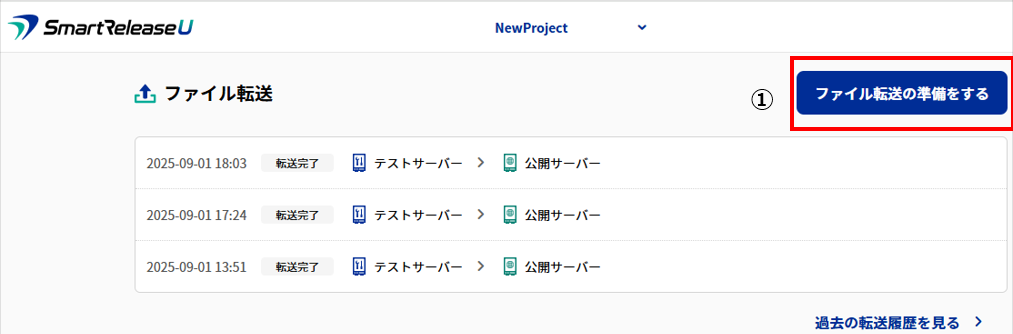 1.プロジェクトTOPから①「ファイル転送の準備をする」をクリック。