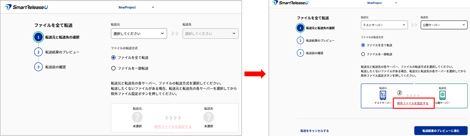 2.転送元と転送先を設定すると、②「除外ファイルを設定する」が赤く表示されるので、クリック。