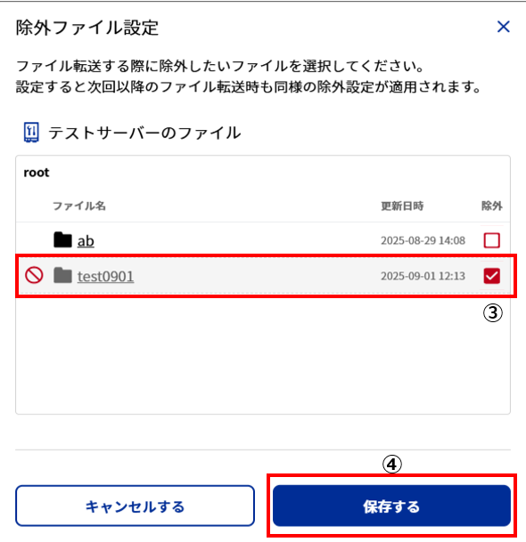 3.➂除外したいファイルやフォルダを一覧から選び、チェックを付け④「保存」をクリック。