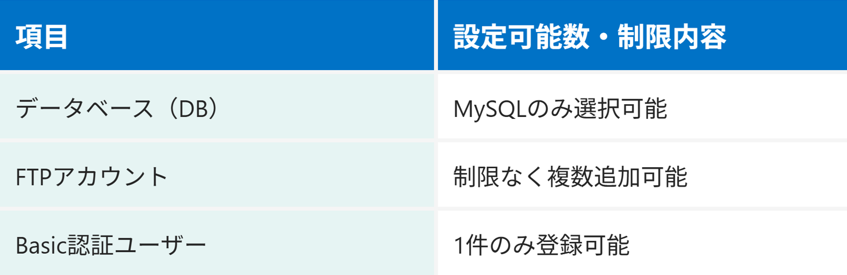 一方、データベースはMySQLのみ選択可能で、Basic認証は1件のみ設定可能です。