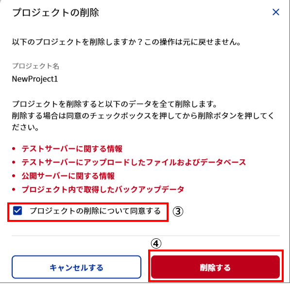プロジェクトが削除できない場合の対応方法は、以下を確認してください。