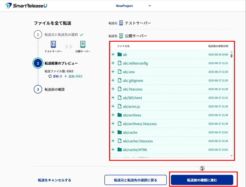 ※除外ファイルの設定をすることが可能。 3.転送対象のファイル一覧が表示されるので、問題なければ、