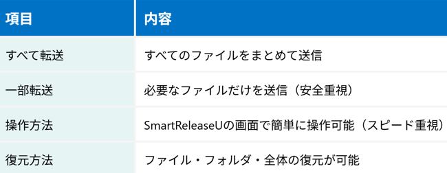 SmartReleaseUでは、画面操作で以下の2つの方法でファイルを転送できます。