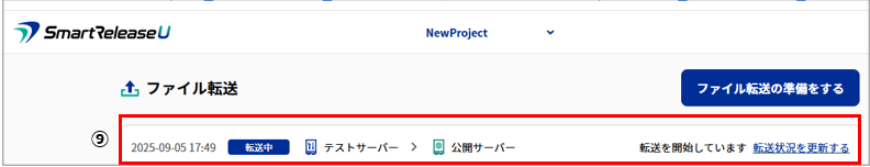 5.プロジェクトTOPの画面に戻り、⑨ファイル転送の表示一覧に履歴が表示される。