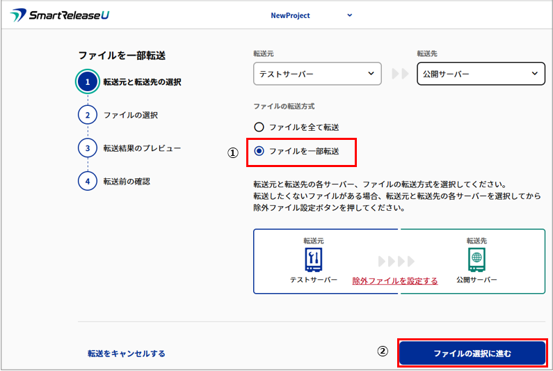 1.転送方式を①「一部転送」に変更し、➁「ファイルの選択に進む」をクリック。