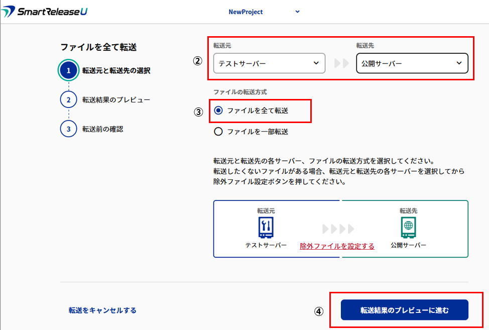 2.➁「転送元」、「転送先」サーバーを選択、➂ファイル転送方式で「ファイルを全て転送」を選択。④「転送結果のプレビューに進む」をクリック。