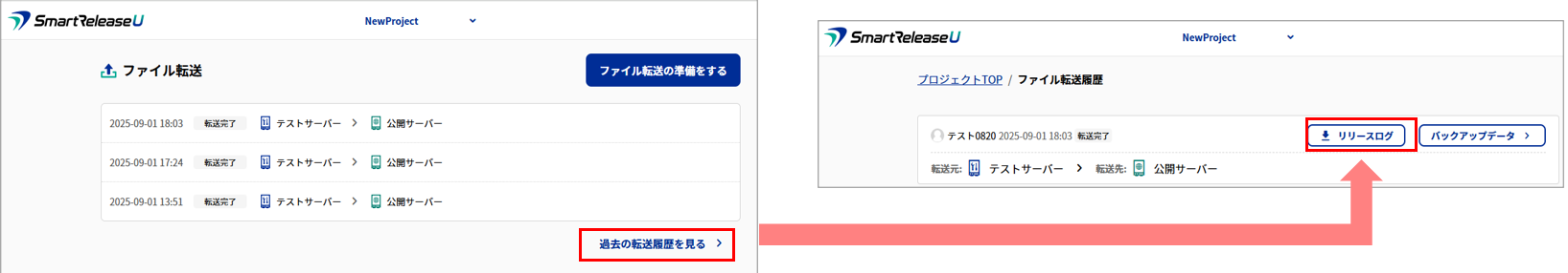•プロジェクトのTOP画面から「過去の転送履歴を見る」で履歴を確認できます。