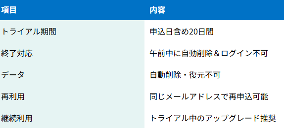 - トライアル終了後、同じメールアドレスで再度トライアル申込や契約が可能です。