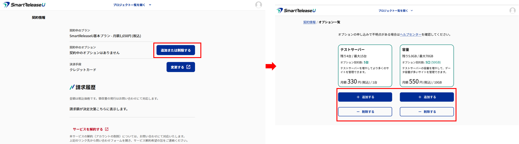 契約情報画面の「追加または削除する」から、テストサーバーや容量の追加・削除が可能。