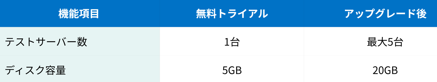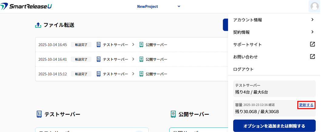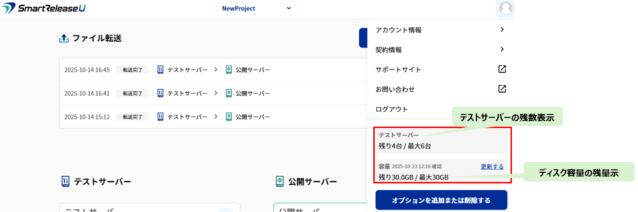 アカウントメニューから、現在の使用容量と契約中のテストサーバー数を確認できる。