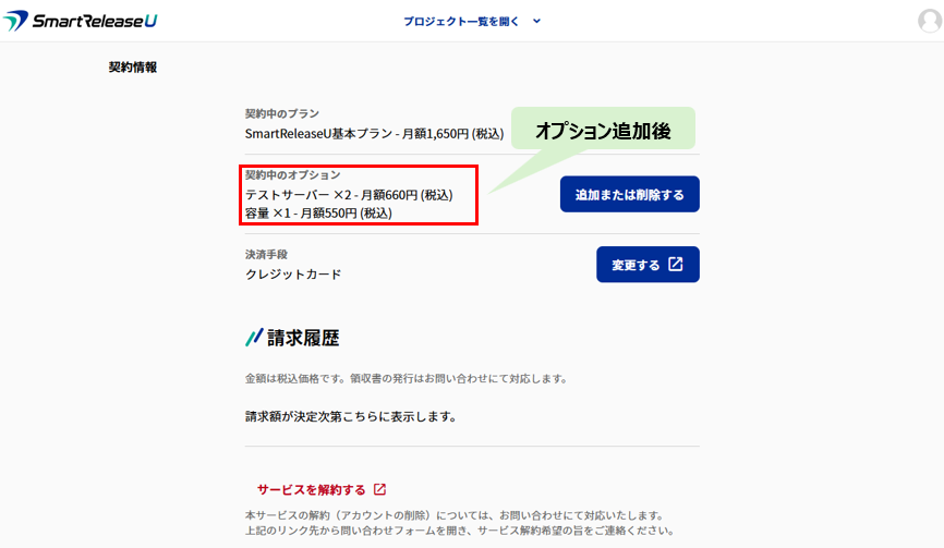 例) アップグレード後の契約情報画面➁ (オプション追加後)