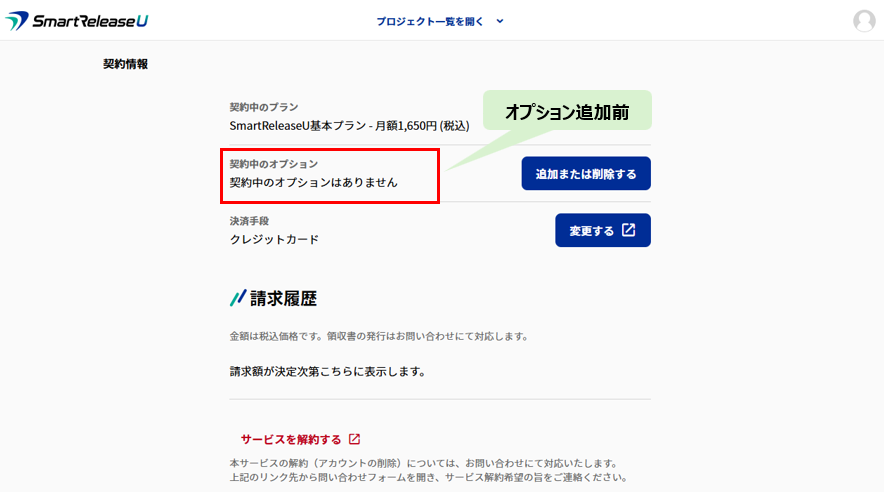 例) アップグレード後の契約情報画面① (オプション追加前)
