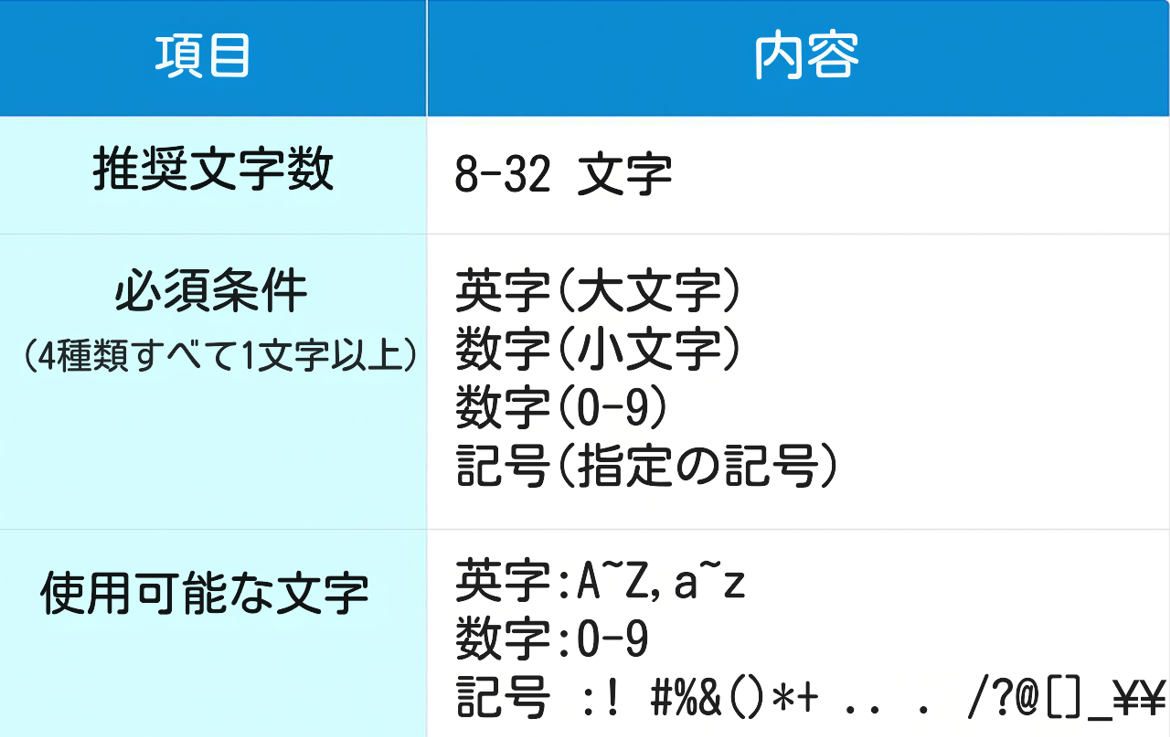 セキュリティ強化のため、以下の表にある推奨文字数・必須条件・使用可能文字をご確認のうえ設定することを推奨しています。