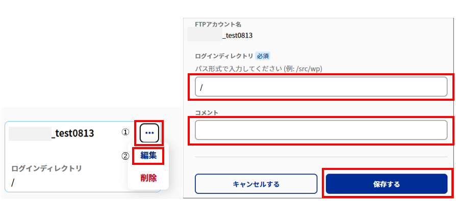 FTPアカウント一覧画面で対象アカウントの①「…」メニューから➁「編集」をクリック。