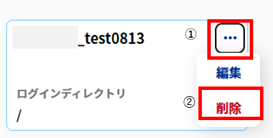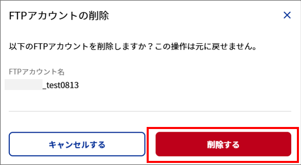 FTPアカウント一覧画面で、対象アカウントの①「…」メニューから➁「削除」をクリック。削除確認画面で、「削除」ボタンをクリックすると、アカウントが完全に削除されます。