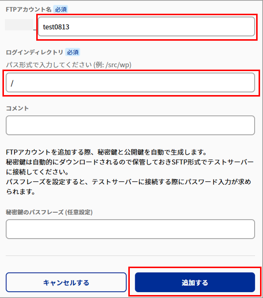 このファイルは、FTPソフトを使ってSFTP接続する際に必要となるため、安全な場所に保管してください。