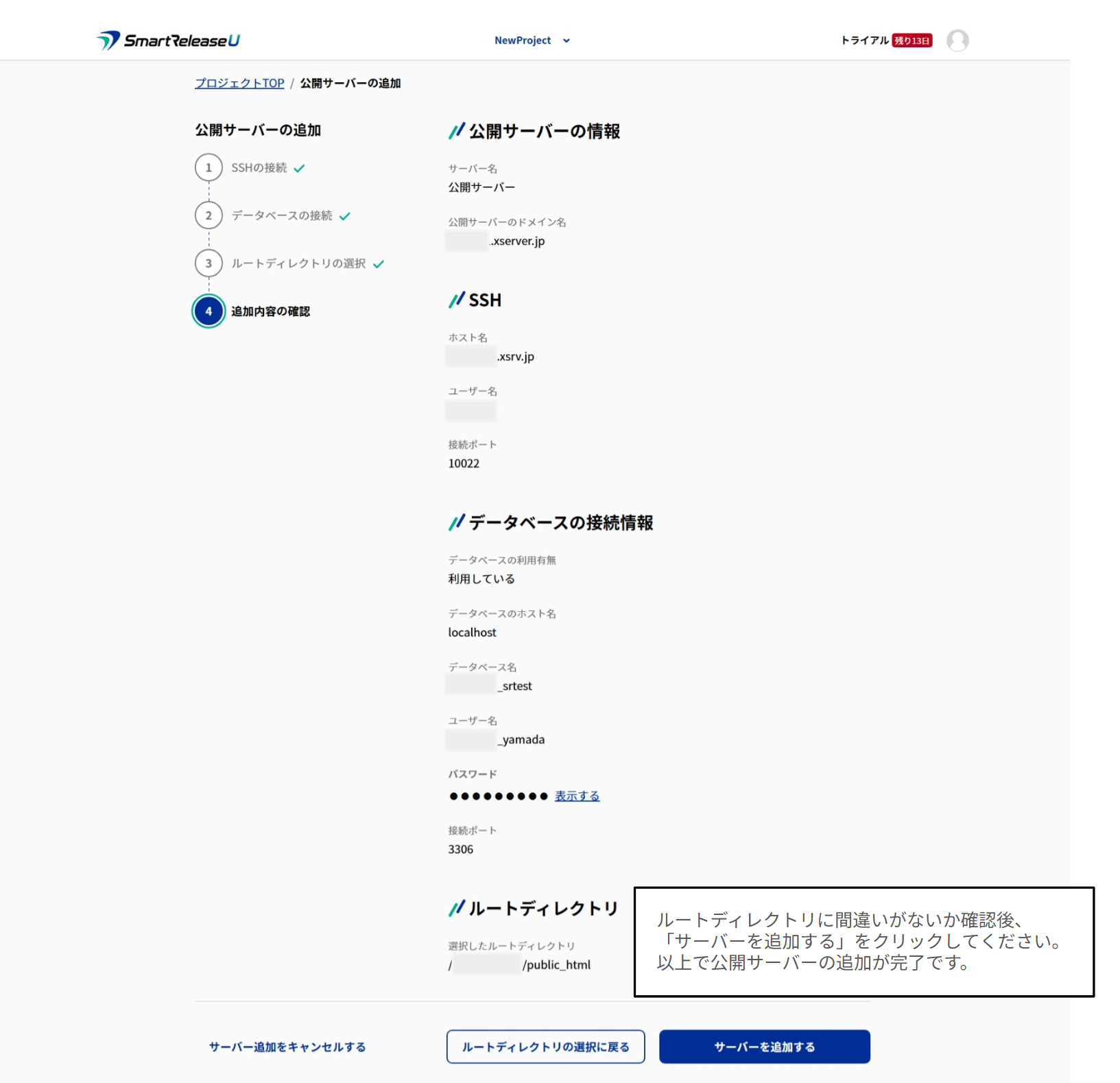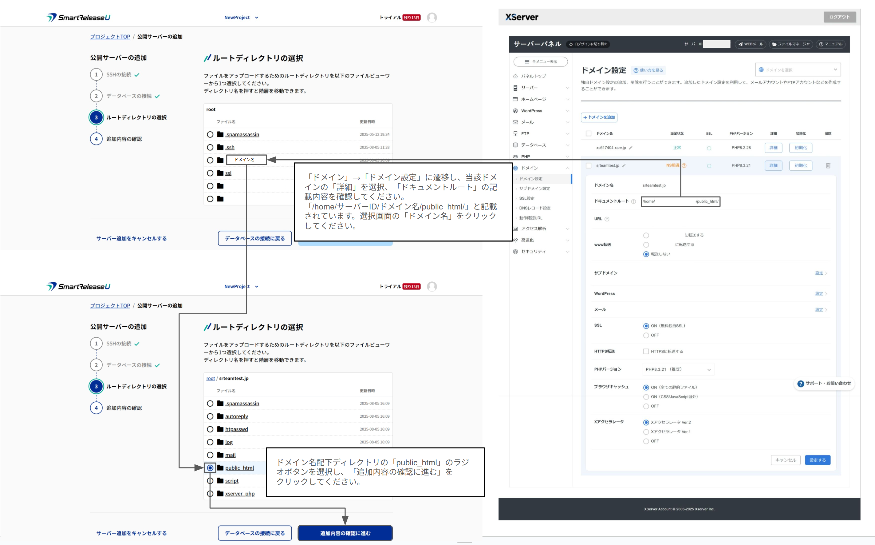 Xserverのコントロールパネルにログインし、「サーバー情報」→「SSH設定」 →「SSHソフト設定」で「サーバー(ホスト名)」「ユーザー名」「接続ポート」を確認し、 SmartReleaseUのコントロールパネルの該当欄にコピーしてください。 公開鍵をコピーしたら、「公開鍵をコピーする」をクリック。 次に、Xserverのコントロールパネルで「SSH設定」→「公開鍵を登録」→ 「登録方式:手動」を選び、コピーした公開鍵を貼り付けて「登録する」 ...