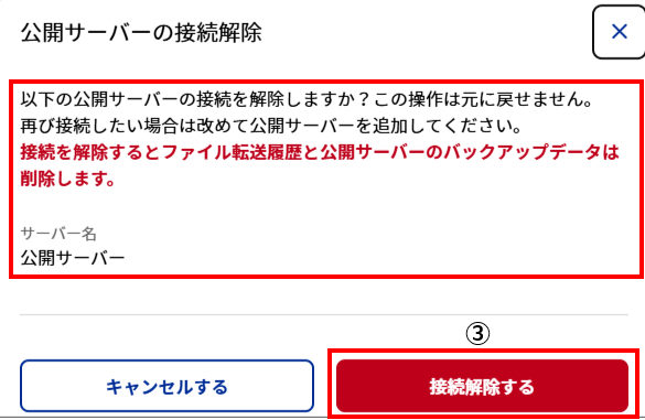 2.表示される注意事項をよく確認し、内容に問題なければ、➂「接続解除する」をクリック。