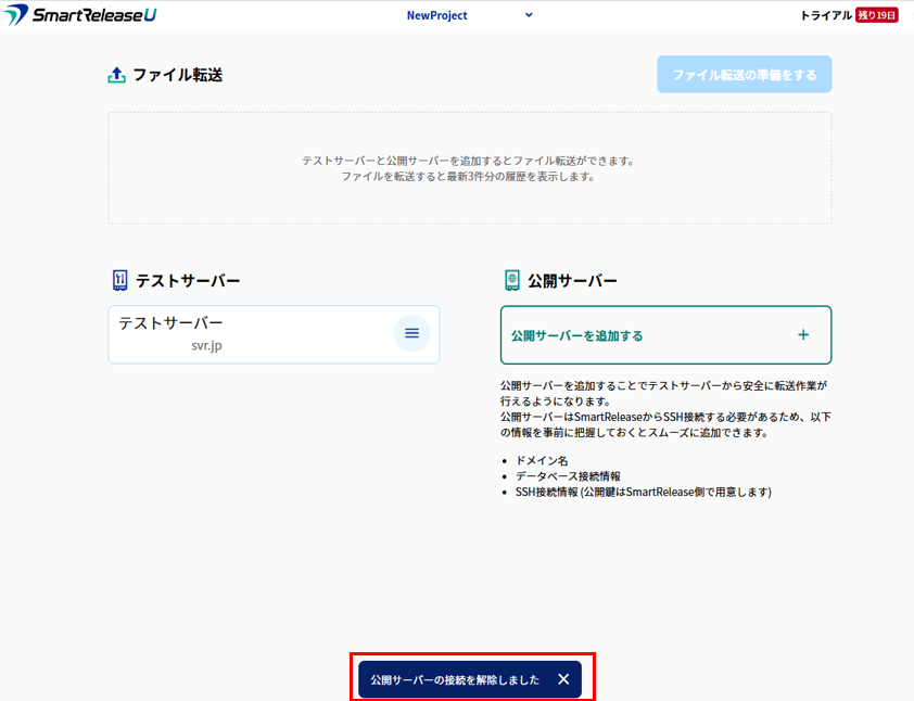 3.画面下部に「公開サーバーの接続を解除しました」のメッセージが表示され、プロジェクトTOP画面自動でに戻る。