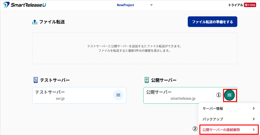1.プロジェクトTOP画面の公開サーバー右側の①「三」マーク(メニュー)をクリックし、➁